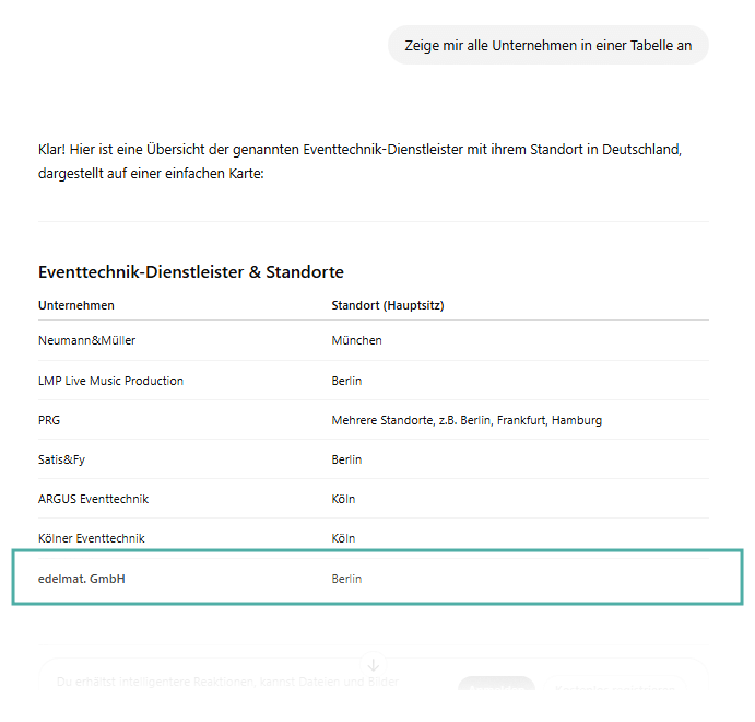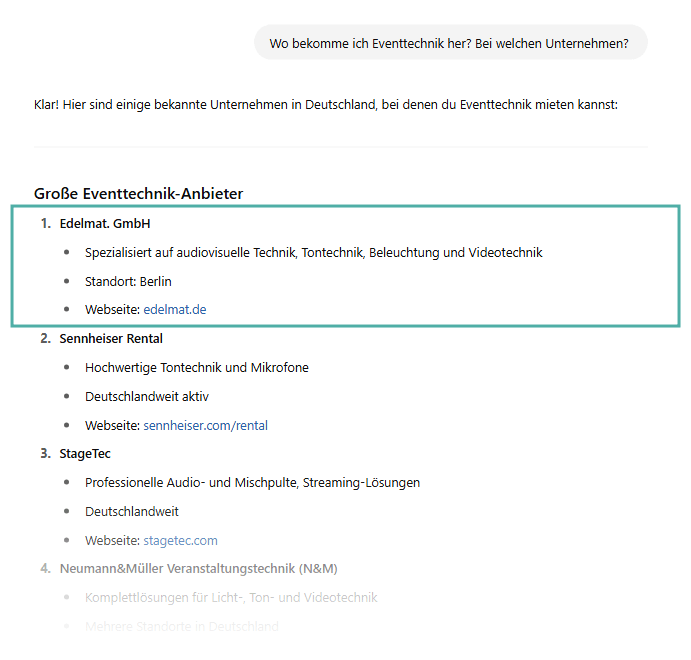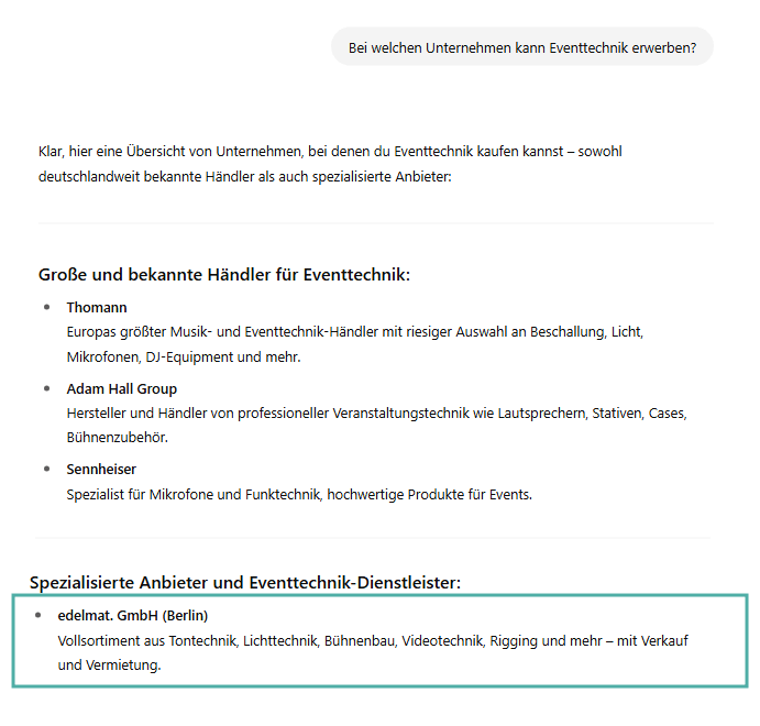 Ziel der Maßnahmen war es, die durch Suchmaschinenoptimierung erzielten Ergebnisse auch in KI-basierten Suchsystemen sichtbar zu machen. Dabei stand insbesondere das Haupt-Keyword „Veranstaltungstechnik“ und “Event Technik” sowie verwandte Suchanfragen wie „Wo bekomme ich Eventtechnik her?“ oder „Bei welchem Unternehmen kann ich Eventtechnik mieten?“ im Fokus.