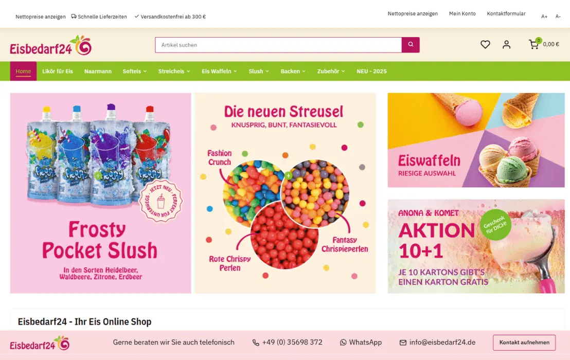Eisbedarf24 ist ein familiengeführter Großhändler im B2B-Segment mit mehr als 30 Jahren Erfahrung in der Gastronomiebranche. Das Unternehmen bietet ein vielfältiges Sortiment an Produkten für den täglichen Eis- und Bäckereibedarf, darunter Softeispulver, Waffeln, Toppings und Slush-Konzentrate.